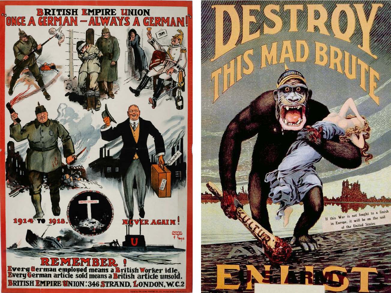 A sinistra: Atrocità attribuite alla Germania imperiale del Kaiser Guglielmo II da parte della propaganda inglese, con tanto di soldati germanici che infilzano neonati con le baionette. A destra: “Vèndicali! Il tempo di agire è adesso”, scrive questo manifesto, che riporta la fola di soldati canadesi che sarebbero stati crocifissi dai tedeschi durante la I Guerra Mondiale. In altri articoli di giornale si accusavano le truppe imperiali tedesche di aver mutilato i seni alle donne e le mani ai bambini belgi, affinché, da adulti, questi non potessero imbracciare le armi.